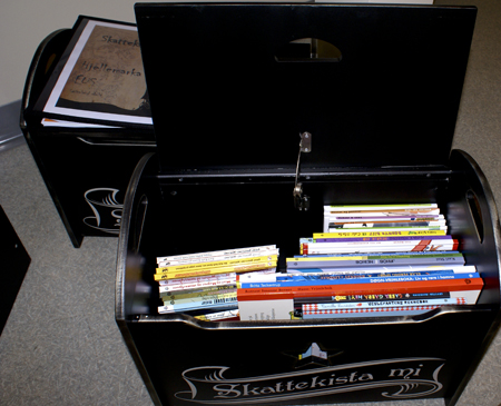 Samarbeidsprosjektet på Os munna nyleg ut i tre skattekister som dei tre barnehagane får. Innhaldet er 35 bøker på nynorsk innan ulike sjangrar, som høgtlesingsbøker, rim og regler og faktabøker.