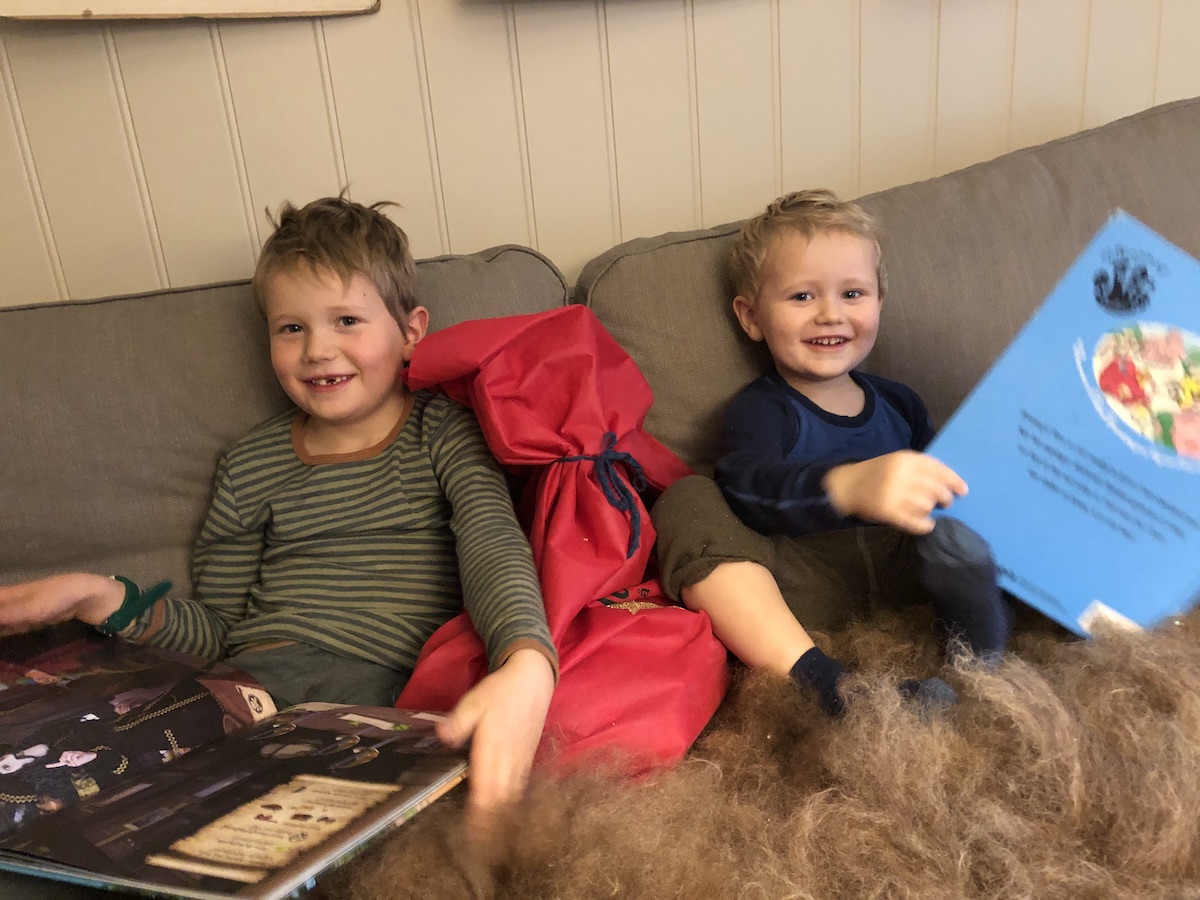 To av dei som har fått bok-kalenderen i år, er Johan (snart 6 år) og Greger (snart 3 år). Kvar morgon tek dei handa oppi sekken, og dreg ut ei ny bok.