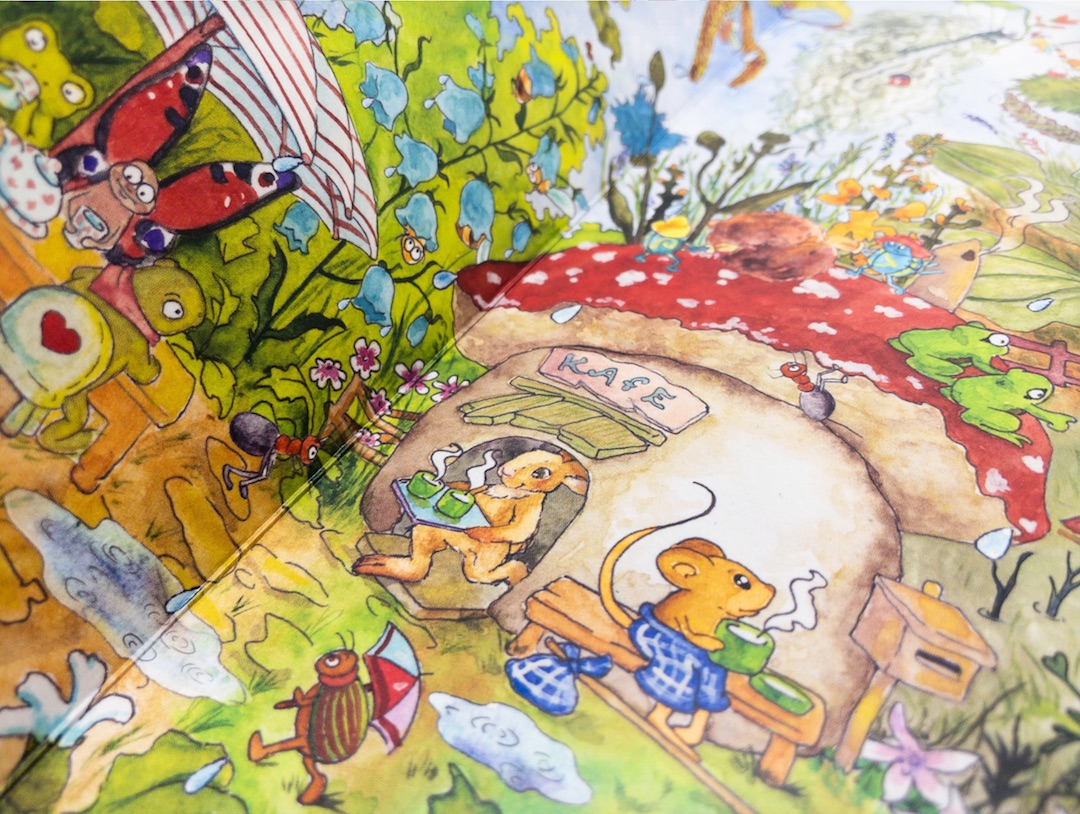 I løpet av seks oppslag på kartongblad blir me tatt med heilt ned på bakken. Her yrer det av liv! Me følgjer Bessie Blåmeis og passasjerane hennar, Amelia Augestikkar, Brevbilla Bastian og fleire andre karakterar. Oppslaga er utan tekst, bortsett frå nokre få skilt. Dei detaljrike teikningane er så fulle av historier at ein kan lesa boka om og om igjen og oppdaga noko nytt kvar gong.